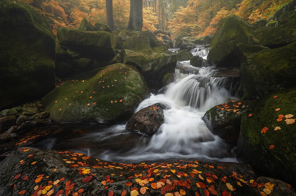 Mein Fokus liegt auf der Wildbachfotografie in Mittelgebirgen wie dem Harz. Ich nutze gerne Langzeitbelichtungen, um fließendes Wasser in seidige, ätherische Flächen zu verwandeln. Dabei sind CPL- und verschiedene Graufilter unerlässlich, um die Belichtungszeit zu verlängern, während Polfilter Reflexionen auf Wasser und nassen Steinen beseitigen.